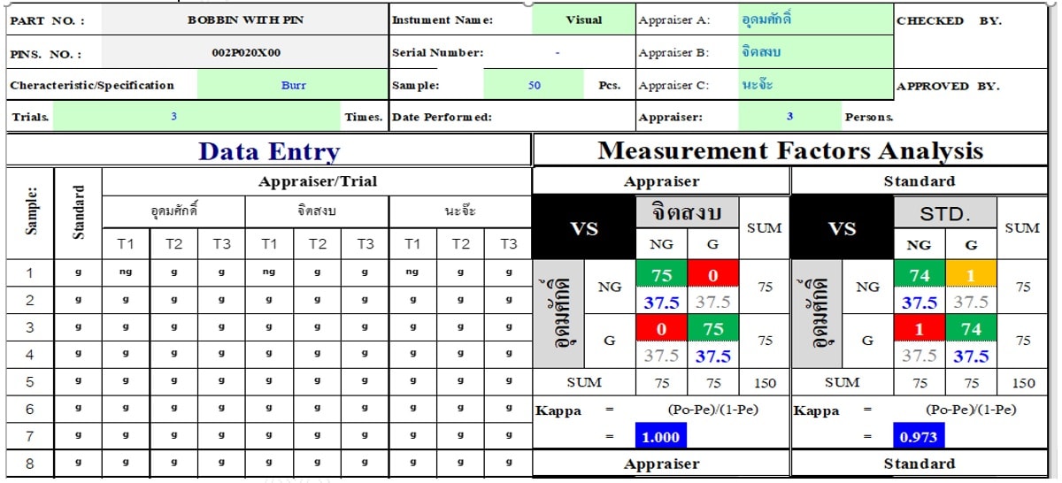 – ชิ้นงาน part เดียวกัน จำนวน 20 ชิ้นขึ้นไป และมีการแบ่งกลุ่มออกเป็น 4 ส่วนดังนี้ ถุงที่ 1 ชิ้นงานดี 30% , ถุงที่ 2 ชิ้นงานเสีย 30% ,ถุงที่ 3 ชิ้นงานที่ตัดสินใจยากแต่ดี 20% ,ถุงที่4 ชิ้นงานที่ตัดสินใจยากแต่เป็นชิ้นงานเสีย 20% ( ผู้เลือกชิ้นงานมาตรฐานต้องเป็นผู้วัดที่มีความสามารถในการตัดสินที่แม่นยำ )